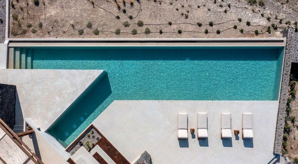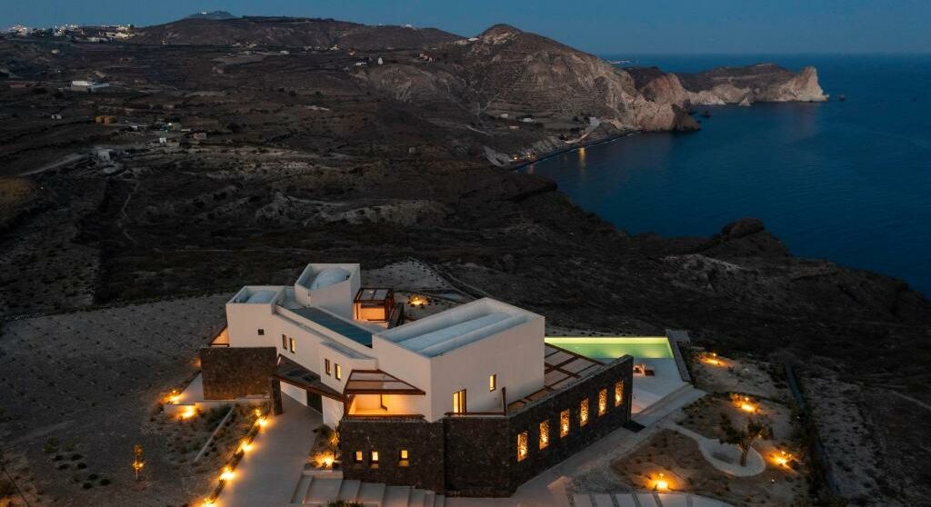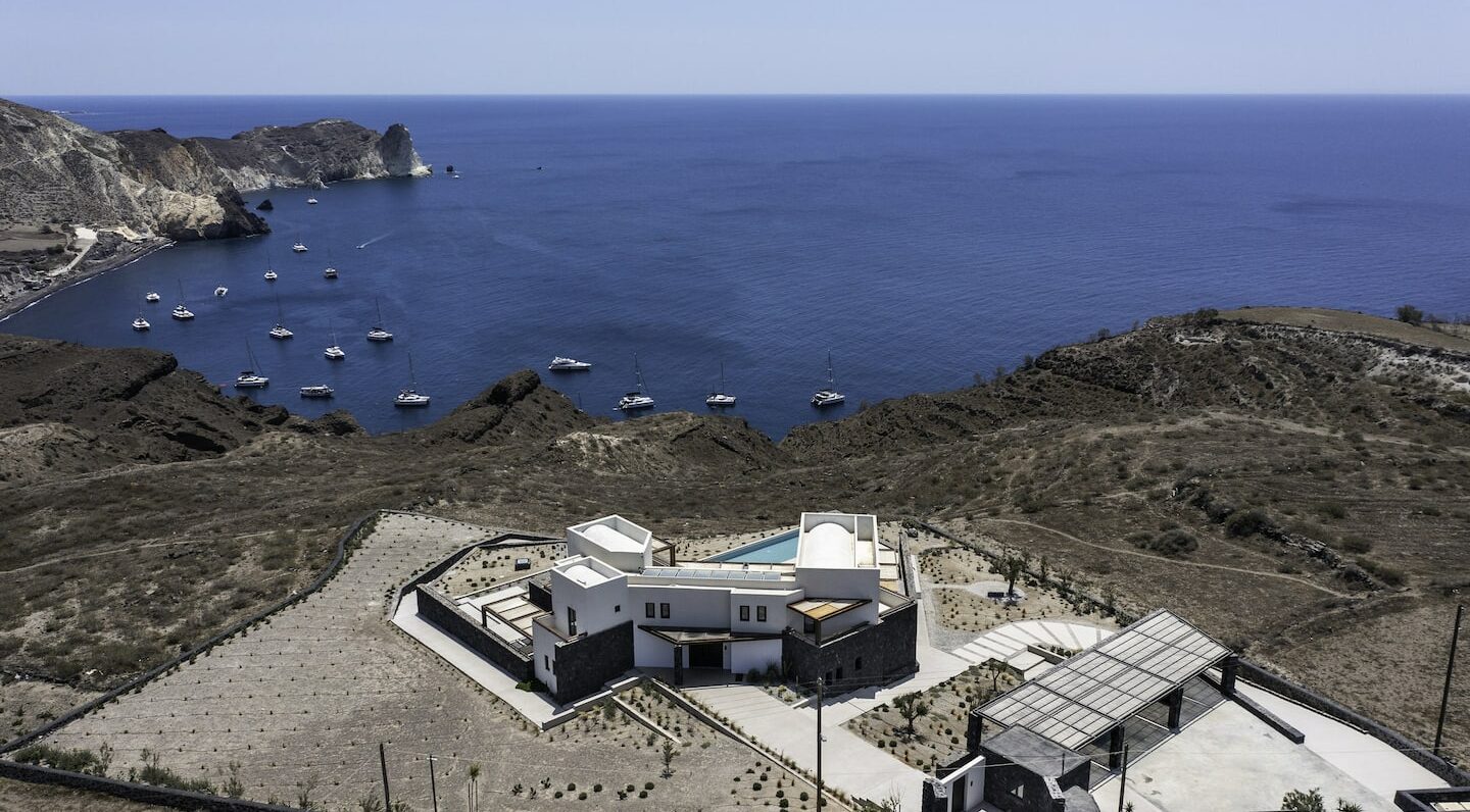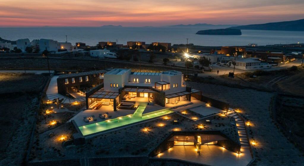 A 325 sqm, three-level villa set in a private vineyard with panoramic Aegean Sea views. Designed for up to 20 guests, the estate offers refined comfort, discreet luxury, and complete privacy in Santorini.