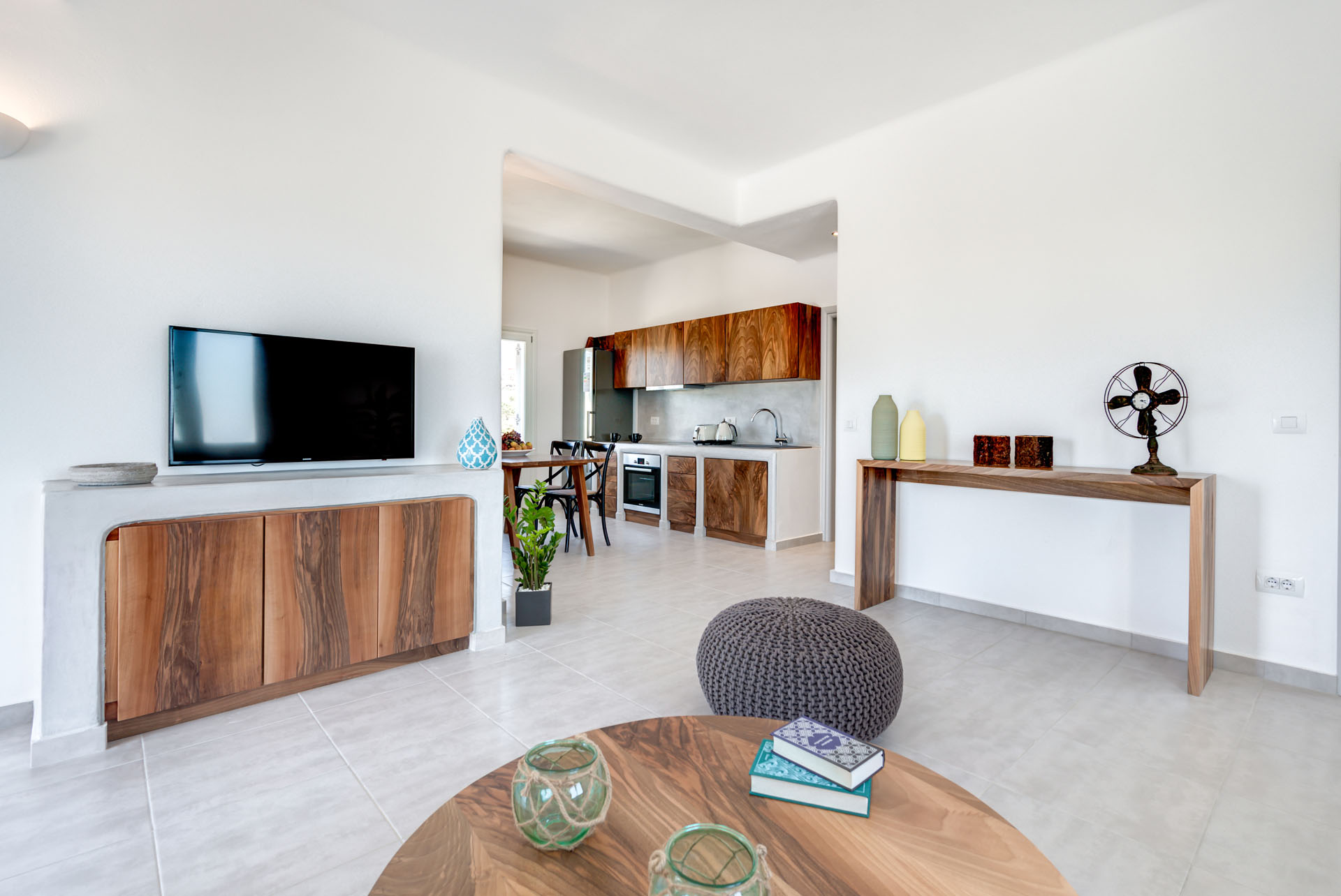 The property sits in a peaceful area surrounded by open land and vineyards with views down to the Aegean sea and being just a short walk to the traditional village of Megalochori.