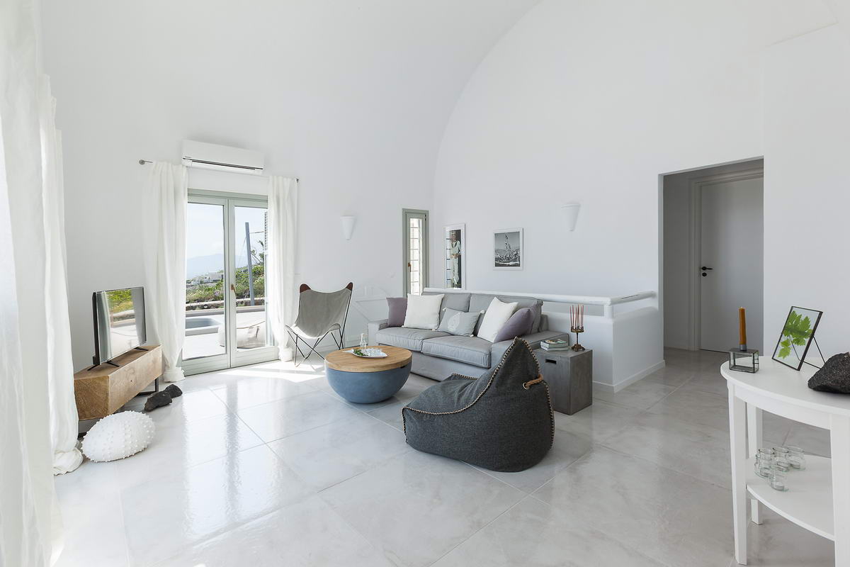 Outside is a spacious terrace with dining area and amazing views over the island of Santorini and looking across to the small island of Anafi.
