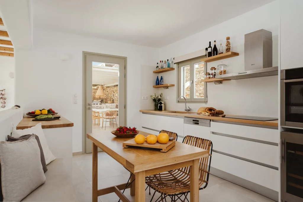 Showcasing a luminous Cycladic design, the villa has been carefully crafted to deliver both refined elegance and complete comfort. Spread across two independent levels, it offers four en-suite bedrooms, each with direct access to the outdoors and captivating sea views. Inside, contemporary styling is softened by crisp white hues and warm, earthy accents, creating an inviting and sophisticated ambience throughout.