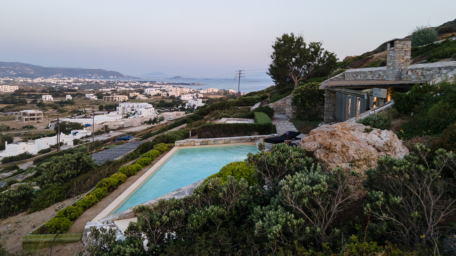 The outside area features a private pool with sun loungers and a covered dining area looking over the Aegean Sea towards Naxos Town which is just 3km from the villa.