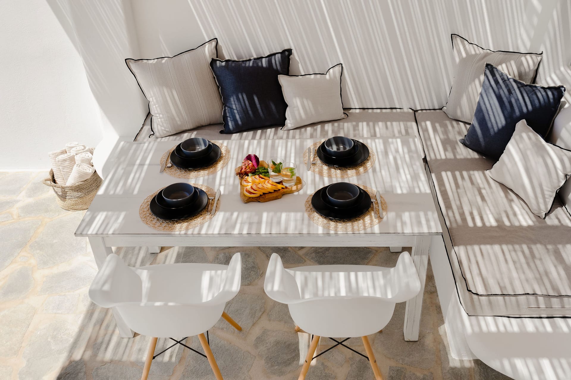 The outside terrace has a private pool, covered dining area, and sun beds for relaxation.