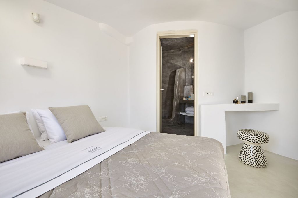 Stylish cave villa with a living area of 40sm offering a double bed, en-suite bathrooms, open plan living area, and a well-equipped kitchenette.