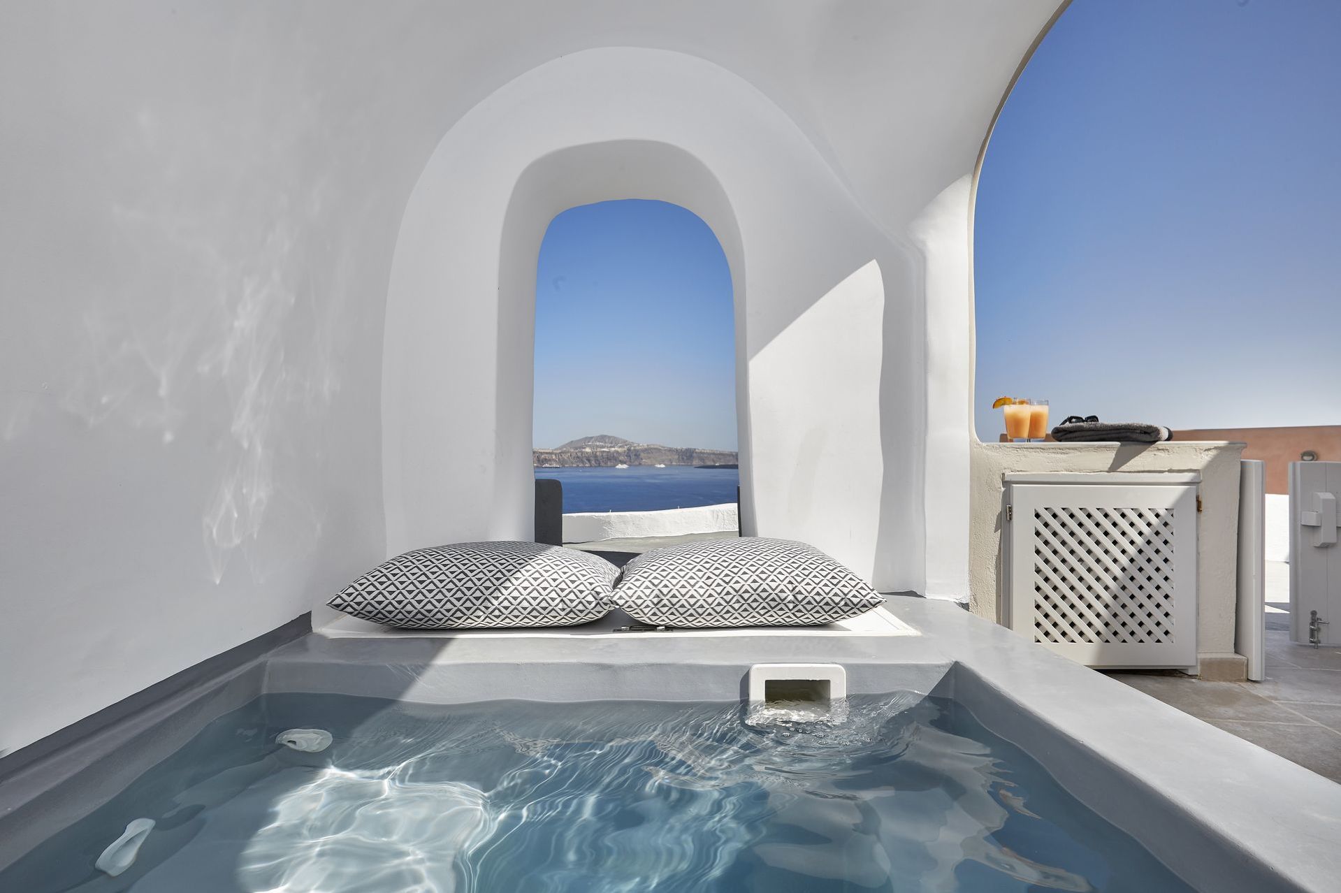 Outside the private terrace has stunning views of the caldera and also features a private cave style hot tub.