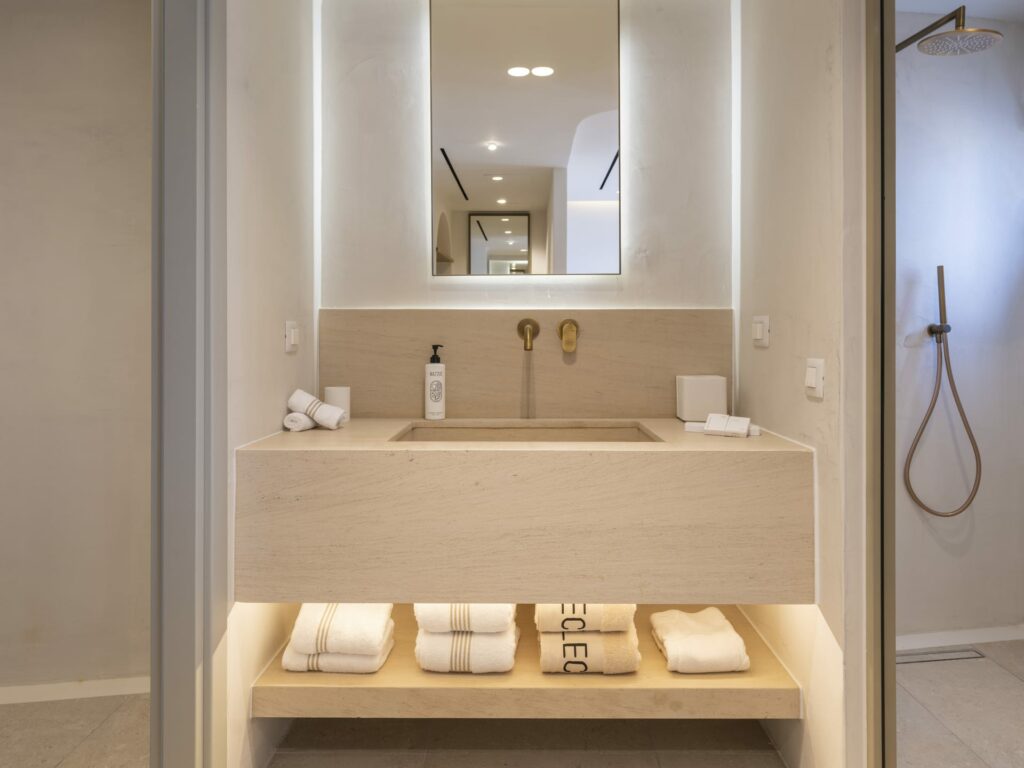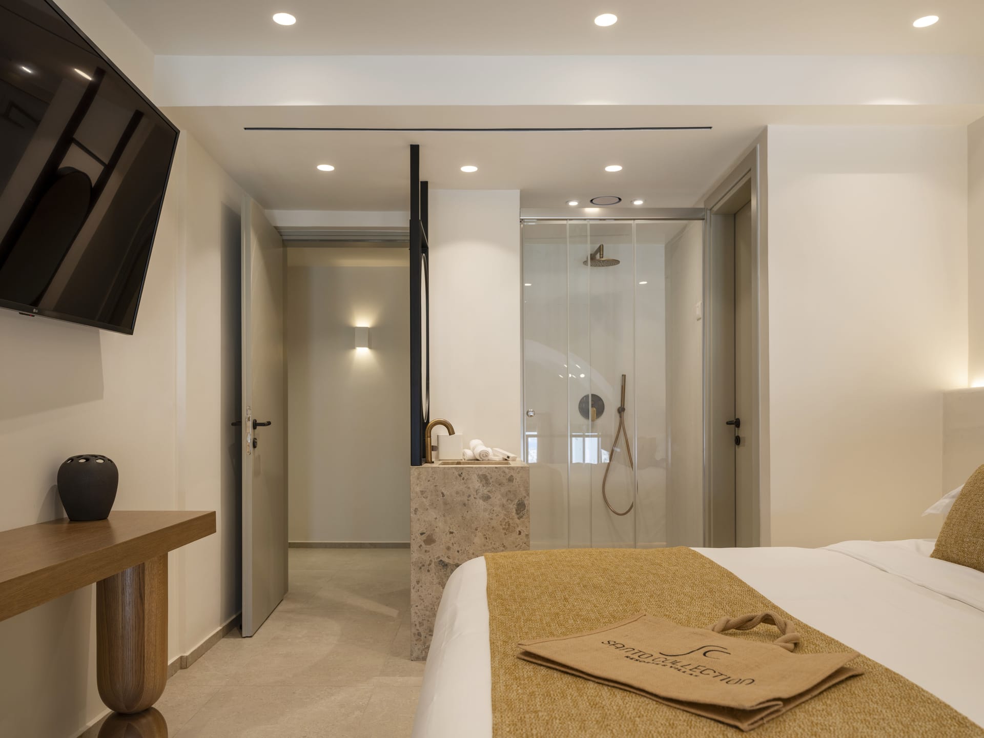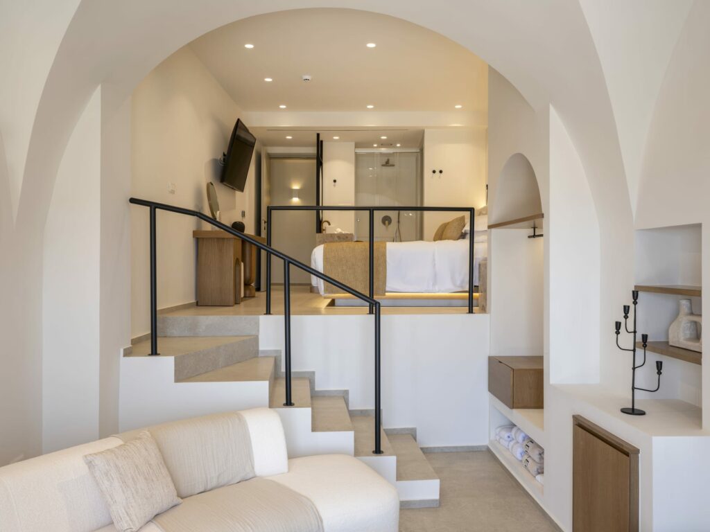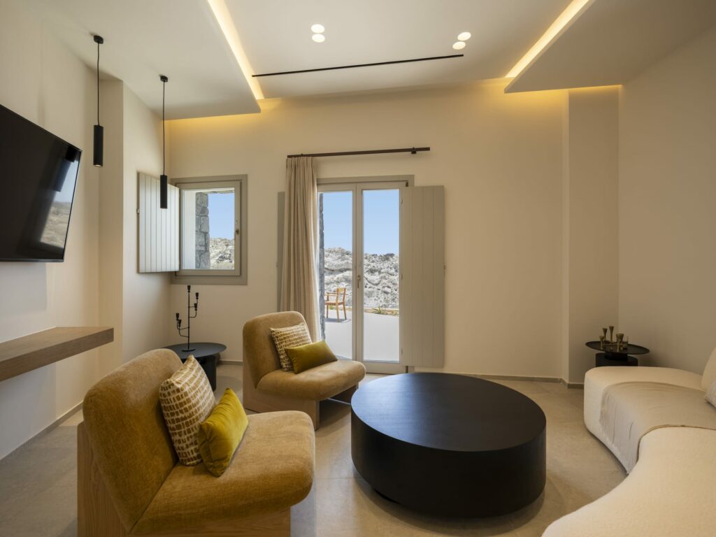Each villa features 4 elegantly appointed en-suite bedrooms and can accommodate up to 8 guests. When booked together as the full Oia Elements Estate, the property transforms into an 8-bedroom luxury haven spanning 1,195 sq.m., comfortably hosting up to 16 guests.
