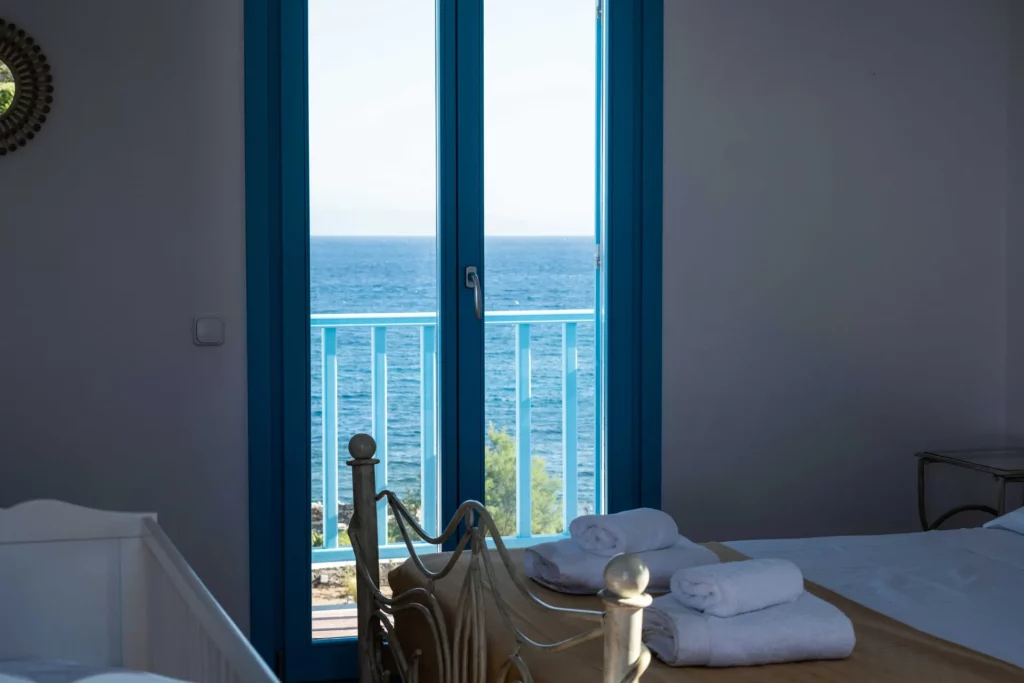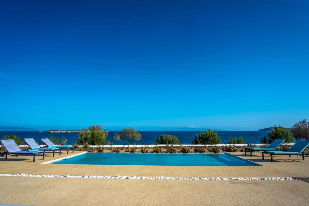 On the main floor, you’ll find a fully equipped kitchen, a spacious living room, and two bedrooms one with a double bed and one with three single beds along with a bathroom. This level opens onto a veranda with a dining table, offering views of the Aegean Sea, the pool, and the Mediterranean garden.