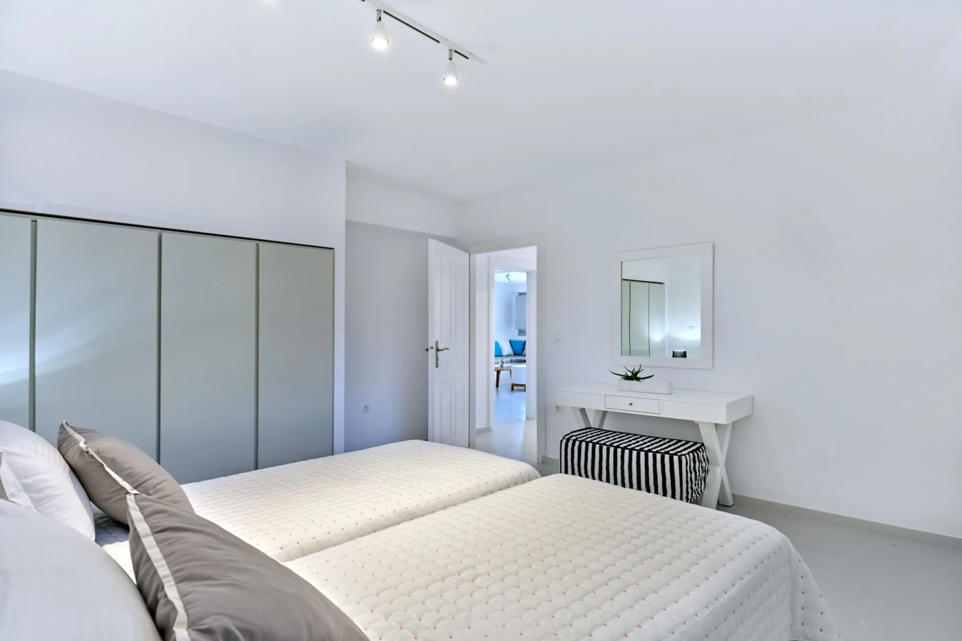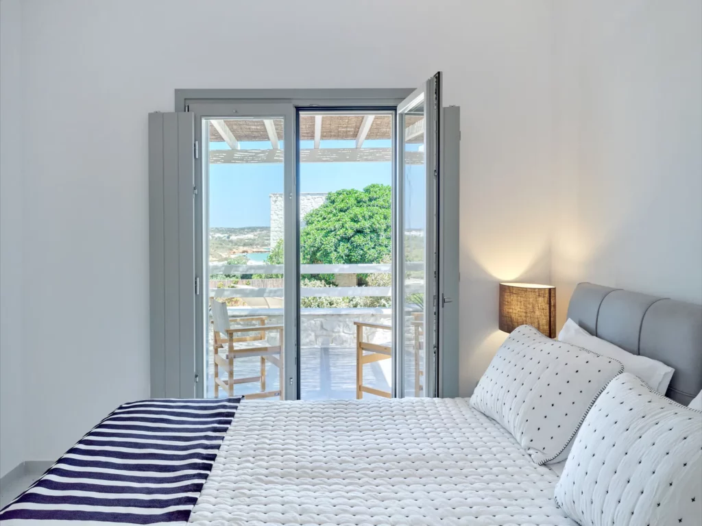 Surrounded by lush gardens, the villa includes a private pool, shaded terraces, and a BBQ area, providing the perfect combination of comfort, elegance, and outdoor living for a quintessential Paros summer escape.