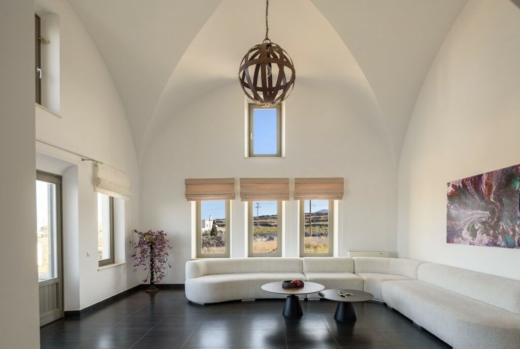 Designed with elegant simplicity, Villa Krinos features large openings on all sides, allowing guests to take in breathtaking views of the sea, the open countryside, vivid sunrises and the warm hues of sunset reflections. The spacious living room is highlighted by a striking double-vaulted ceiling, divided by an arch and a double-sided energy fireplace that connects seamlessly to the magnificent domed dining area.