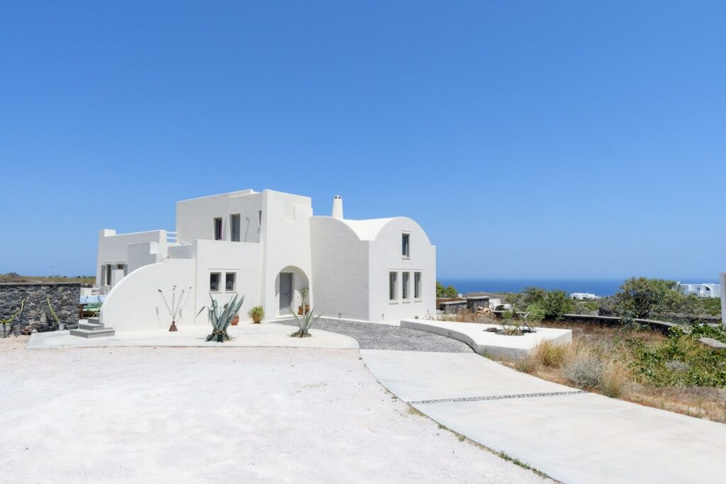 Recently built and finished to exceptionally high standards, the villa is set within a peaceful rural landscape of vineyards, yet enjoys a highly convenient location on the edge of Fira’s lively centre and just 1.7 km from the calm, well-organised beach of Exo Gialos. It is an ideal base from which to explore Santorini, with all major attractions just a short drive away.